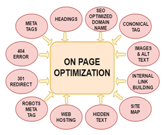 On Page Optimization : On page optimization refers to all measures taken by SEOs within the website to improve the ranking of a site in search engine result pages. These measures are related to content and HTML source code of a page, e.g. meta tags, keyword placement, keyword density and Content etc.